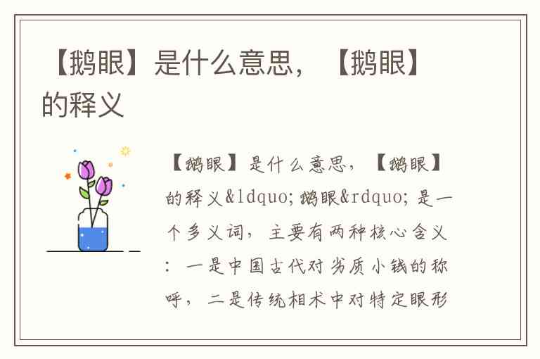 “鹅眼”是一个多义词,主要有两种核心含义:一是中国古代对劣质小钱的称呼,二是传统相术中对特定眼形的描述。前者作为货币术语使用更广泛,后者则多见于民俗文化与面相学文献。
