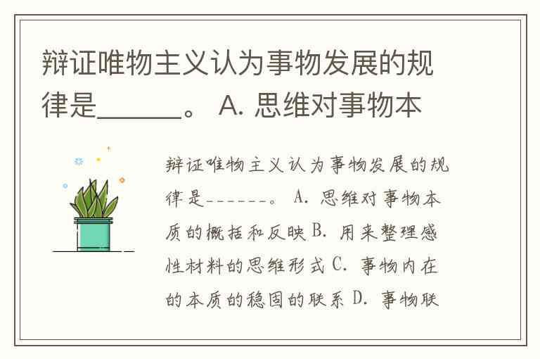 辩证唯物主义认为事物发展的规律是______。 A. 思维对事物本质的概括和反映 B. 用来整理感性材料的思维形式 C. 事物内在的本质的稳固的联系 D. 事物联系和发展的基本环节