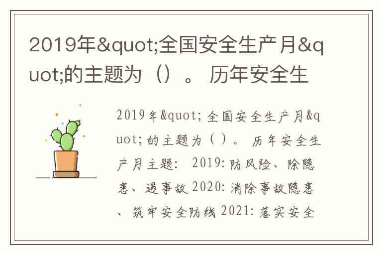 2019年"全国安全生产月"的主题为防风险、除隐患、遏事故。这一主题反映了当时安全生产工作的核心导向:通过主动识别风险、系统消除隐患来预防事故发生,体现了我国安全生产管理从"事后处置"向"事前预防"转型的思路。