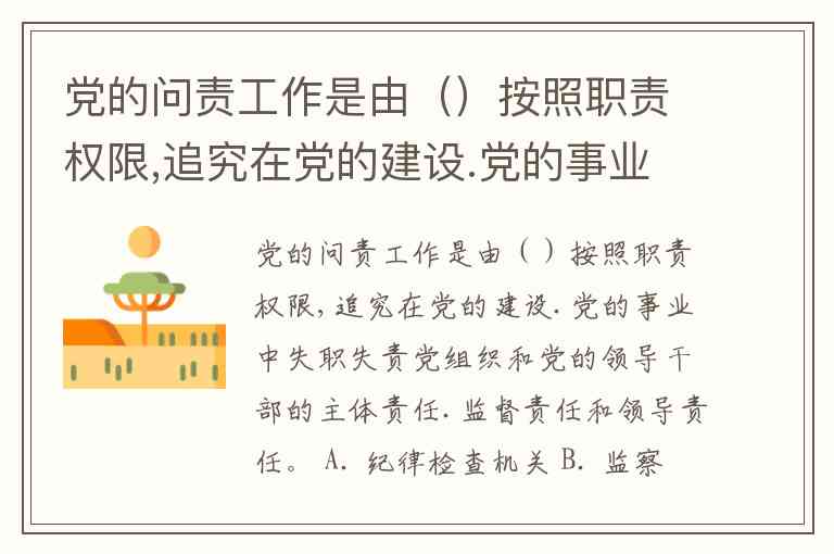 党的问责工作是由()按照职责权限,追究在党的建设.党的事业中失职失责党组织和党的领导干部的主体责任.监督责任和领导责任。 A. 纪律检查机关 B. 监察机关 C. 党组织 D. 组织部门