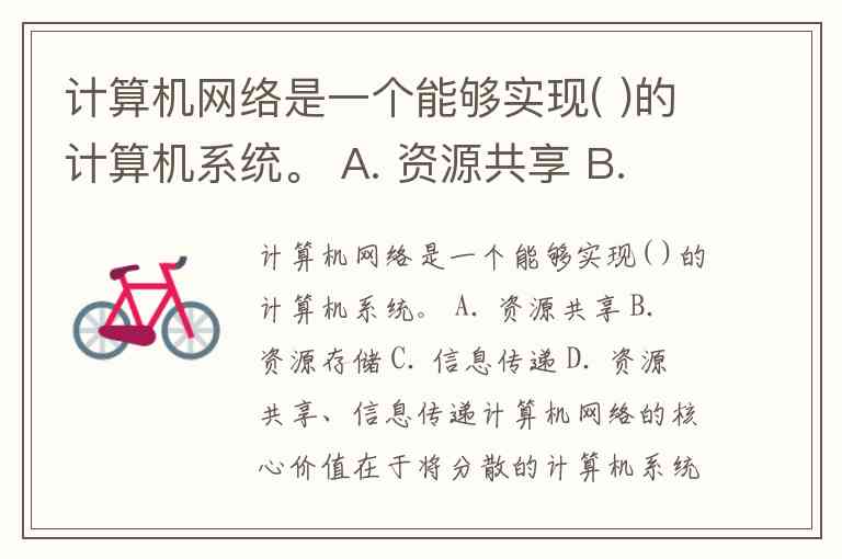 计算机网络是一个能够实现( )的计算机系统。 A. 资源共享 B. 资源存储 C. 信息传递 D. 资源共享、信息传递