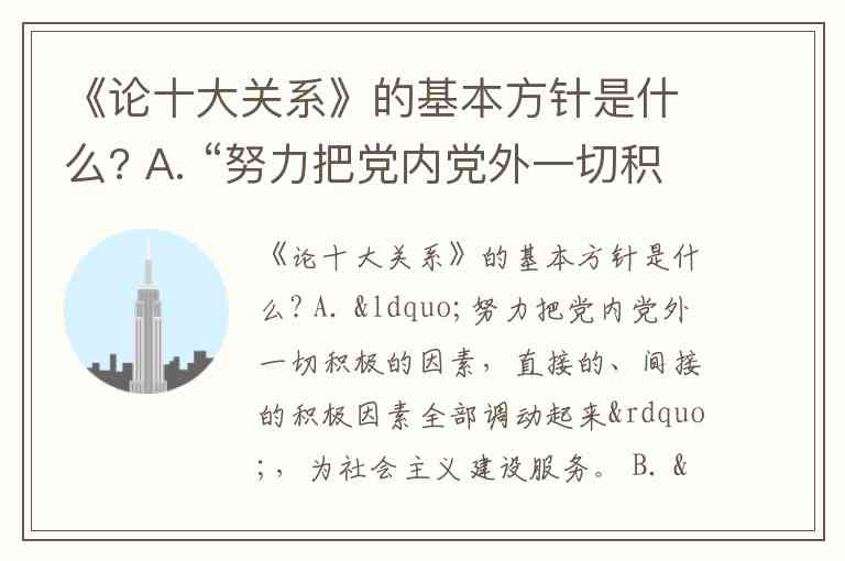 《论十大关系》的基本方针是什么? A. “努力把党内党外一切积极的因素,直接的、间接的积极因素全部调动起来”,为社会主义建设服务。 B. “努力把国内国外的一切积极的因素,直接的、间接的积极因素全部调动起来”,为社会主义建设服务。 C. “努力把党内党外、国内国外的一切积极的因素,直接的、间接的积极因素全部调动起来”,为社会主义建设服务。 D. “努力把直接的、间接的积极因素全部调动起来”,为社会主义建设服务。