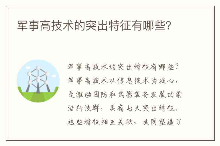 军事高技术以信息技术为核心,是推动国防和武器装备发展的前沿科技群,具有七大突出特征。这些特征相互关联,共同塑造了现代军事科技的发展形态与应用逻辑。
