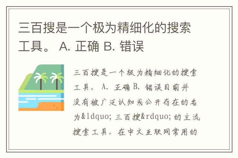 目前并没有被广泛认知或公开存在的名为“三百搜”的主流搜索工具。在中文互联网常用的搜索引擎中,常见的有百度、搜狗、360搜索等,但“三百搜”这一名称并不在主流或知名搜索工具之列。从工具名称的合理性来看,这类命名方式也不符合主流搜索引擎的品牌命名习惯。因此,该说法错误,正确答案是 B. 错误。