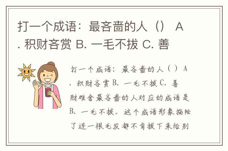 打一个成语:最吝啬的人() A. 积财吝赏 B. 一毛不拔 C. 善财难舍
