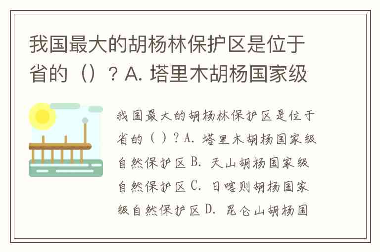 我国最大的胡杨林保护区是位于省的()? A. 塔里木胡杨国家级自然保护区 B. 天山胡杨国家级自然保护区 C. 日喀则胡杨国家级自然保护区 D. 昆仑山胡杨国家级自然保护区