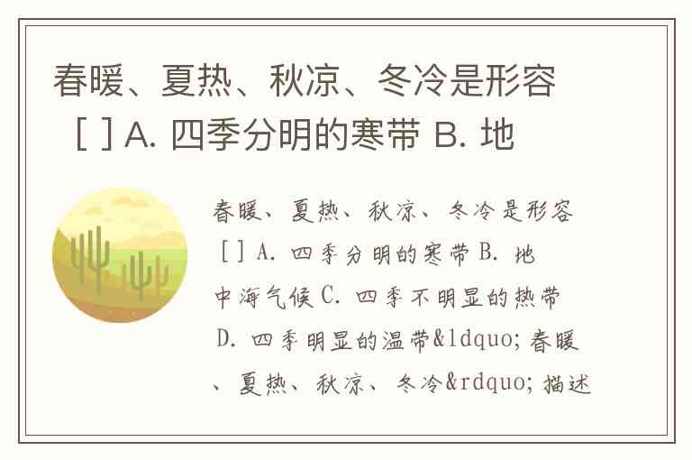 春暖、夏热、秋凉、冬冷是形容 [ ] A. 四季分明的寒带 B. 地中海气候 C. 四季不明显的热带 D. 四季明显的温带
