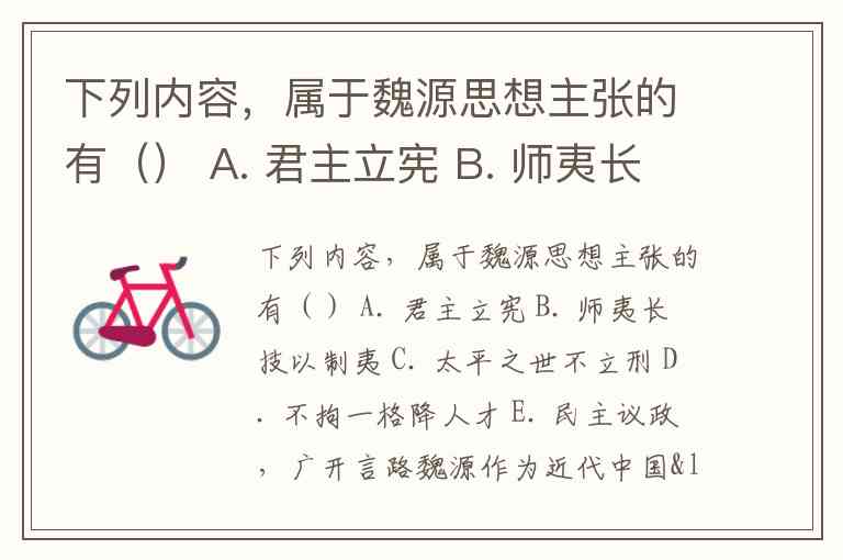 下列内容,属于魏源思想主张的有() A. 君主立宪 B. 师夷长技以制夷 C. 太平之世不立刑 D. 不拘一格降人才 E. 民主议政,广开言路