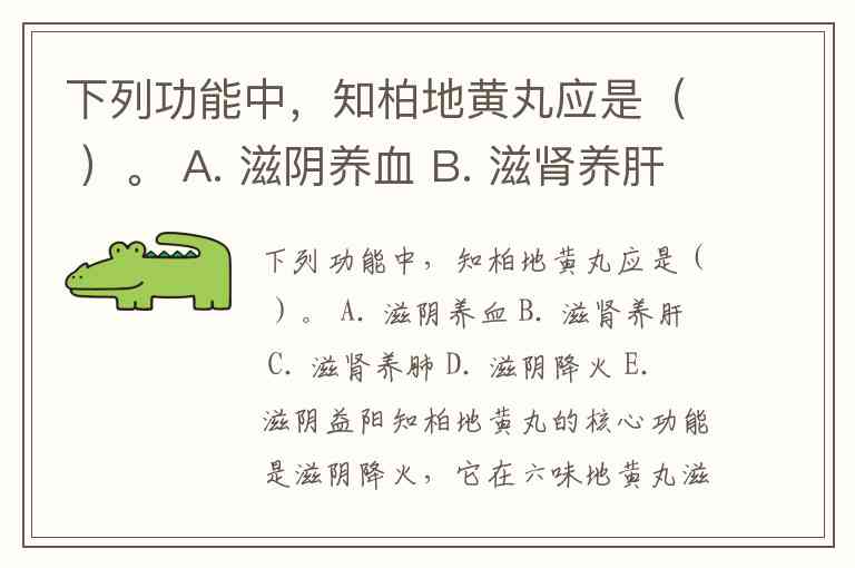 下列功能中,知柏地黄丸应是( )。 A. 滋阴养血 B. 滋肾养肝 C. 滋肾养肺 D. 滋阴降火 E. 滋阴益阳