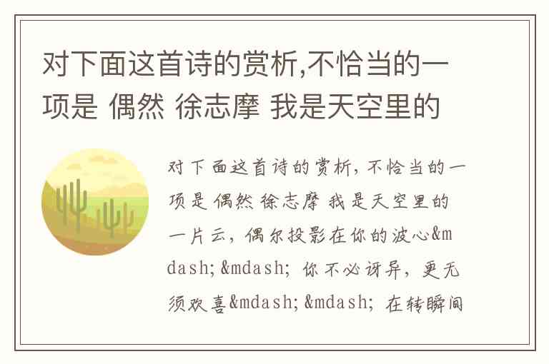 对下面这首诗的赏析,不恰当的一项是 偶然 徐志摩 我是天空里的一片云, 偶尔投影在你的波心—— 你不必讶异, 更无须欢喜—— 在转瞬间消灭了踪影。 你我相逢在黑夜的海上, 你有你的,我有我的,方向; 你记得也好,[最好你忘掉, 在这交会时互放的光亮! A. 这首诗把“偶然”这样一个极为抽象的时间副词形象化,充满情趣,富有哲理,不但珠圆玉润,朗朗上口,而且余味无穷,溢于言外。 B. 此诗写的是两件比较实在的事情,一是天空里的云偶尔投影在水里的波心,二是“你”“我”(都是象征性的意象)相逢在海上。 C. 如果我们用“我和你”“相似”之类的标题,当会富有诗味。 D. “云”、“波”、“你”、“我”、“黑夜的海”、“互放的光亮”等意象及其之间的关系构成,都可以因为读者个人情感阅历的差异,及体验强度的深浅而进行不同的理解。