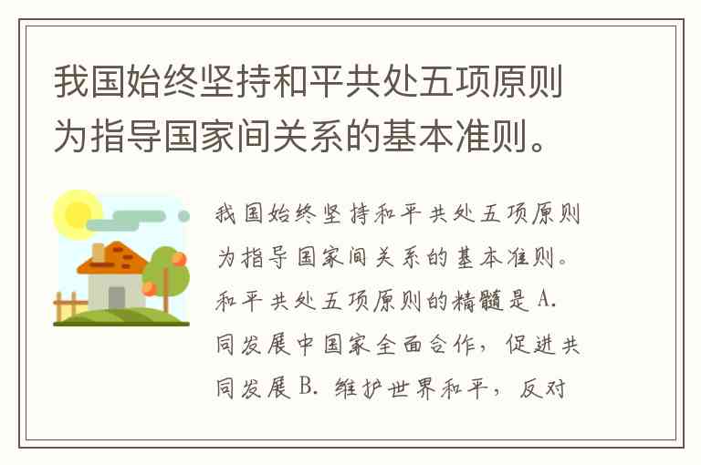 我国始终坚持和平共处五项原则为指导国家间关系的基本准则。和平共处五项原则的精髓是 A. 同发展中国家全面合作,促进共同发展 B. 维护世界和平,反对强权政治 C. 坚持用和平方式而不是战争手段解决国际争端 D. 国家主权平等