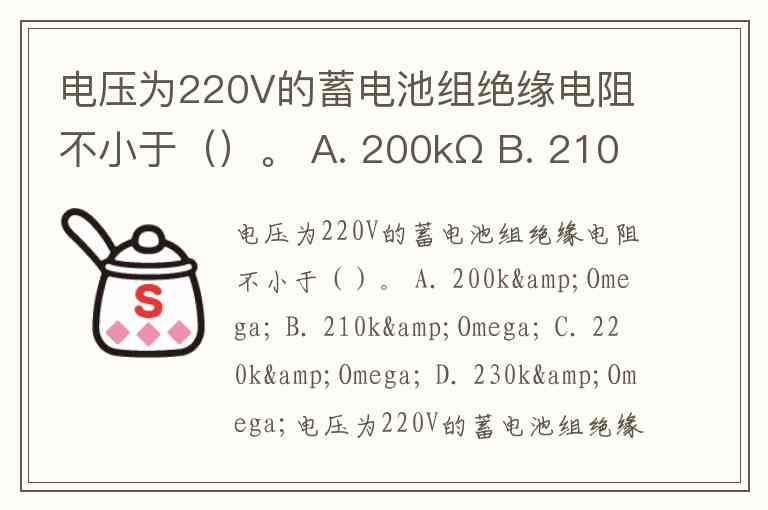 电压为220V的蓄电池组绝缘电阻不小于()。 A. 200kΩ B. 210kΩ C. 220kΩ D. 230kΩ