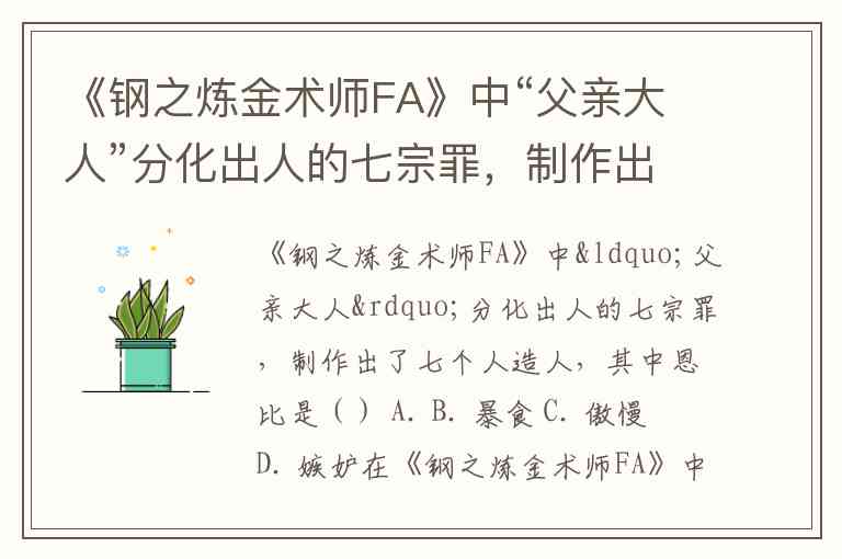 《钢之炼金术师FA》中“父亲大人”分化出人的七宗罪,制作出了七个人造人,其中恩比是() A. B. 暴食 C. 傲慢 D. 嫉妒