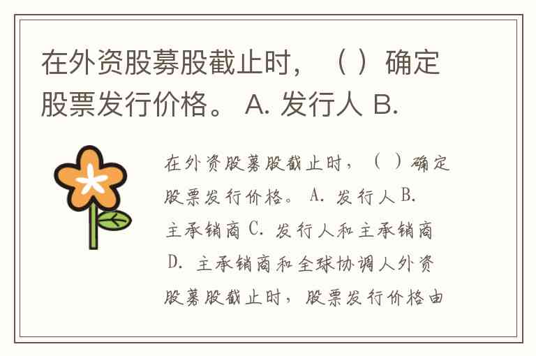 在外资股募股截止时,( )确定股票发行价格。 A. 发行人 B. 主承销商 C. 发行人和主承销商 D. 主承销商和全球协调人