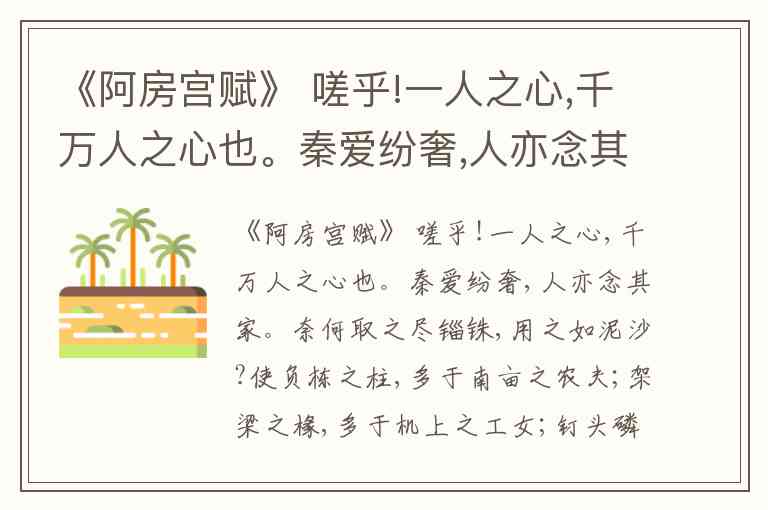 《阿房宫赋》中这些词语的理解需结合语境与历史背景:锱铢是古代极小的重量单位,文中形容秦朝搜刮财富时连细微之处都不放过;南亩即农田,与"农夫"搭配明确指代农业生产领域;九土对应"九州",是中国古代对全国疆域的统称;呕哑形容乐器声嘈杂刺耳,并非单纯指"难听",而是通过声音的混乱表现宫廷生活的奢靡;独夫特指秦始皇这样的独裁者,而非"孤单的人";戍卒明确指陈胜吴广等揭竿而起的起义者;楚人在此处指项羽,他率军攻入咸阳后焚烧阿房宫;焦土则形象描述了阿房宫被焚毁后的惨状。