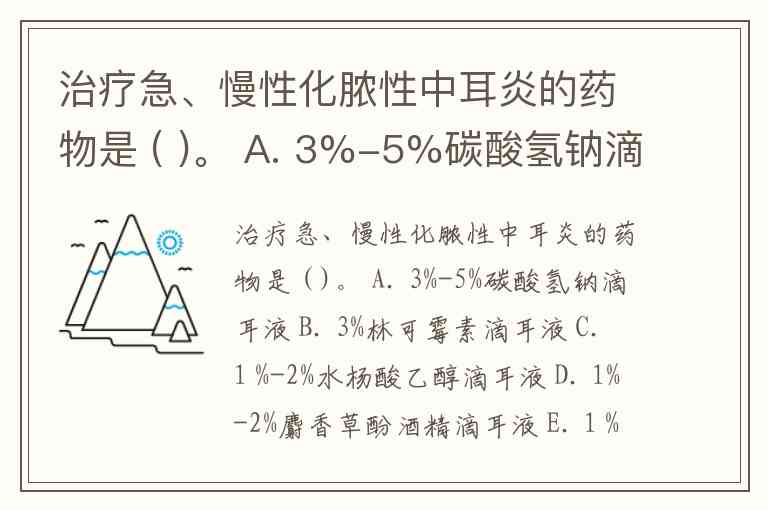 治疗急、慢性化脓性中耳炎的药物是 ( )。 A. 3%-5%碳酸氢钠滴耳液 B. 3%林可霉素滴耳液 C. 1 %-2%水杨酸乙醇滴耳液 D. 1%-2%麝香草酚酒精滴耳液 E. 1 %-2%苯酚甘油