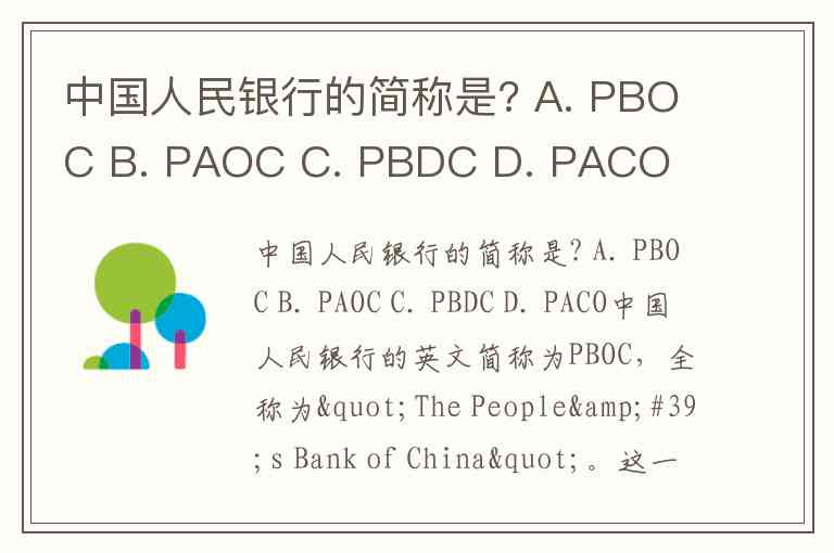中国人民银行的简称是? A. PBOC B. PAOC C. PBDC D. PACO