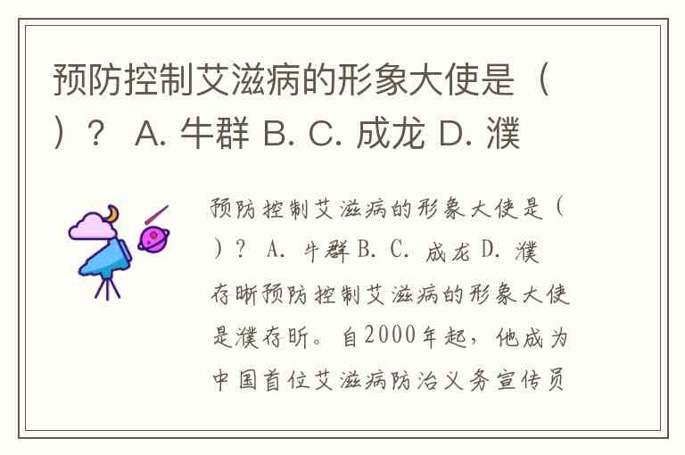 预防控制艾滋病的形象大使是()? A. 牛群 B. C. 成龙 D. 濮存晰