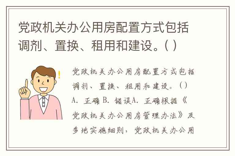党政机关办公用房配置方式包括调剂、置换、租用和建设。( ) A. 正确 B. 错误