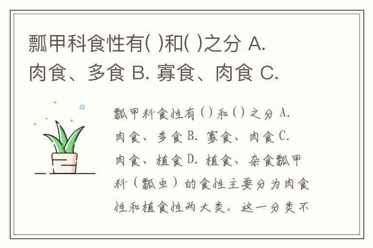 瓢甲科食性有( )和( )之分 A. 肉食、多食 B. 寡食、肉食 C. 肉食、植食 D. 植食、杂食