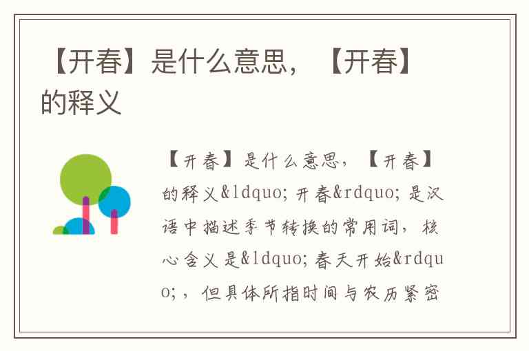 “开春”是汉语中描述季节转换的常用词,核心含义是“春天开始”,但具体所指时间与农历紧密相关——通常指农历正月或立春前后,这一时期标志着万物复苏的自然节律与农耕活动的重启。它既体现了古人对时令的观察,也承载着对新生与希望的文化象征。