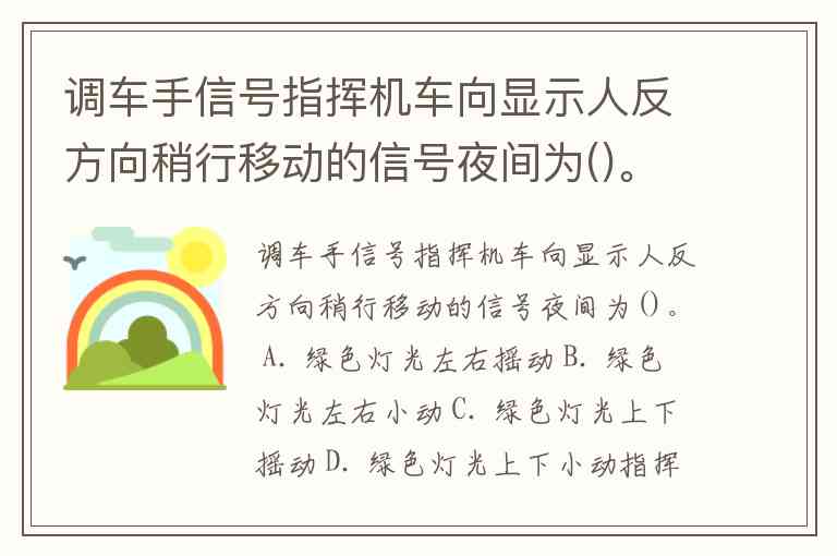 调车手信号指挥机车向显示人反方向稍行移动的信号夜间为()。 A. 绿色灯光左右摇动 B. 绿色灯光左右小动 C. 绿色灯光上下摇动 D. 绿色灯光上下小动