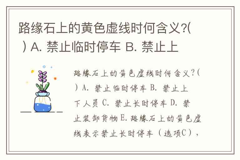 路缘石上的黄色虚线时何含义?( ) A. 禁止临时停车 B. 禁止上下人员 C. 禁止长时停车 D. 禁止装卸货物 E.