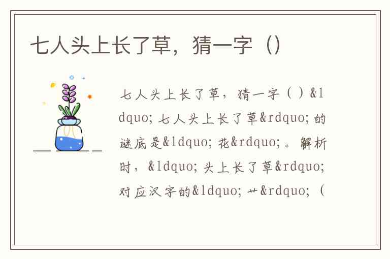 “七人头上长了草”的谜底是“花”。解析时,“头上长了草”对应汉字的“艹”(草字头);“七人”可拆解为“化”——“化”字由“人”(亻)和形似“七”的“匕”组成(字谜中常以字形相近暗扣)。将“艹”与“化”组合,便得到“花”字。