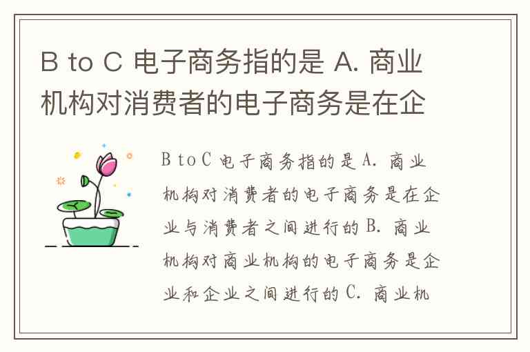 B to C 电子商务指的是 A. 商业机构对消费者的电子商务是在企业与消费者之间进行的 B. 商业机构对商业机构的电子商务是企业和企业之间进行的 C. 商业机构对政府的电子商务是在企业与政府机构之间进行的 D. 消费者对政府的电子商务是政府对个人的