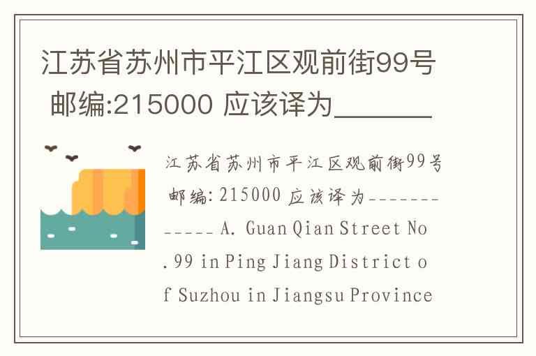 江苏省苏州市平江区观前街99号 邮编:215000 应该译为____________ A. Guan Qian Street No.99 in Ping Jiang District of Suzhou in Jiangsu Province 215000 B. No.99 Guan Qian Str., Ping Jiang District, Suzhou city, Jiangsu Province 215000 C. No.99 Guanqian Jie, Ping Jiang District, Suzhou, Jiangsu Province 215000 D. No.99 Guanqian Street, Pingjiang District, Suzhou, Jiangsu Province 215000 China
