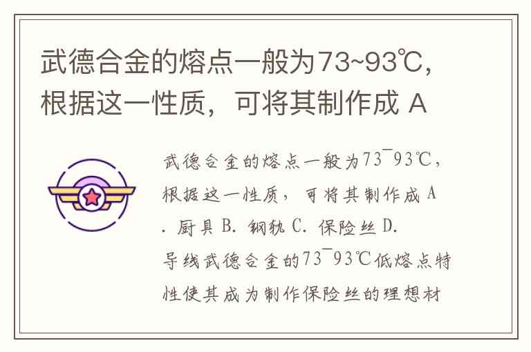 武德合金的熔点一般为73~93℃,根据这一性质,可将其制作成 A. 厨具 B. 钢轨 C. 保险丝 D. 导线