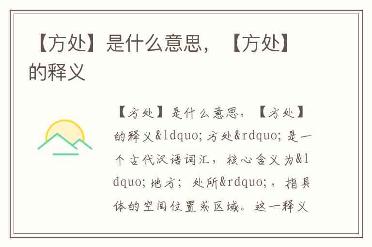 综上,“方处”的核心释义仍以“地方;处所”为主,其使用可追溯至魏晋时期的文献,至今在古籍阅读或特定文学创作中偶有出现。理解这一词汇时,应优先把握其空间位置的基本含义,再结合上下文判断是否存在引申义。