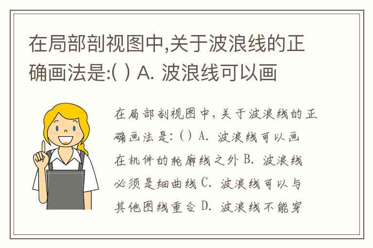 在局部剖视图中,关于波浪线的正确画法是:( ) A. 波浪线可以画在机件的轮廓线之外 B. 波浪线必须是细曲线 C. 波浪线可以与其他图线重合 D. 波浪线不能穿空而过
