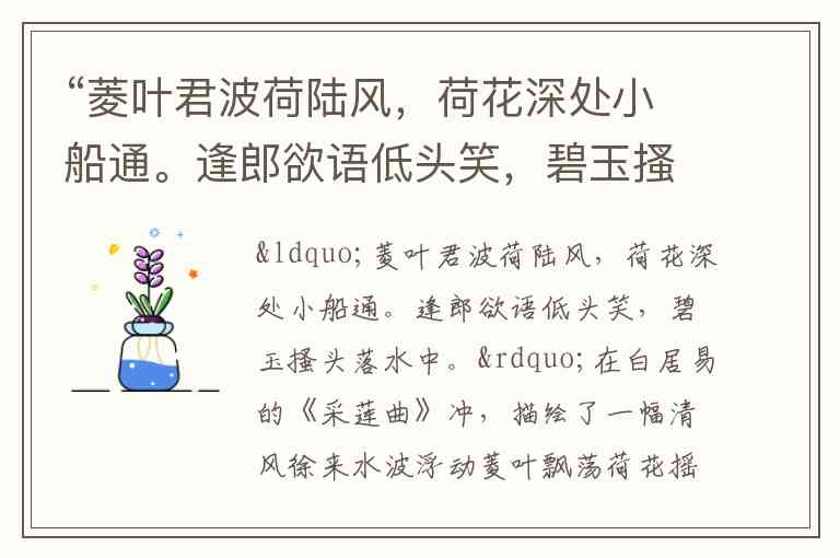 白居易《采莲曲》的意境是诗人对现实生活的艺术提炼与情感投射的结合体。诗中“菱叶萦波荷飐风”的自然景象与“碧玉搔头落水中”的少女情态,既源于江南采莲的劳动场景,又融入了诗人对初恋羞涩之美的独特感悟,形成情景交融的审美空间。