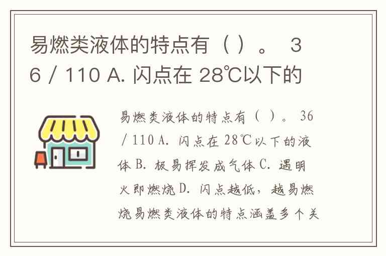 易燃类液体的特点有( )。 36 / 110 A. 闪点在 28℃以下的液体 B. 极易挥发成气体 C. 遇明火即燃烧 D. 闪点越低,越易燃烧