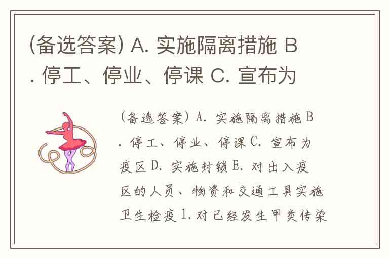 (备选答案) A. 实施隔离措施 B. 停工、停业、停课 C. 宣布为疫区 D. 实施封锁 E. 对出入疫区的人员、物资和交通工具实施卫生检疫 1.对已经发生甲类传染病病例的场所,所在地县级以上地方人民政府可 2.对本行政区域内的甲类传染病疫区,省级人民政府可