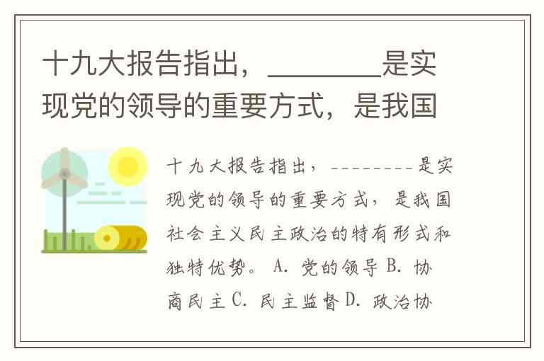 十九大报告指出,________是实现党的领导的重要方式,是我国社会主义民主政治的特有形式和独特优势。 A. 党的领导 B. 协商民主 C. 民主监督 D. 政治协商