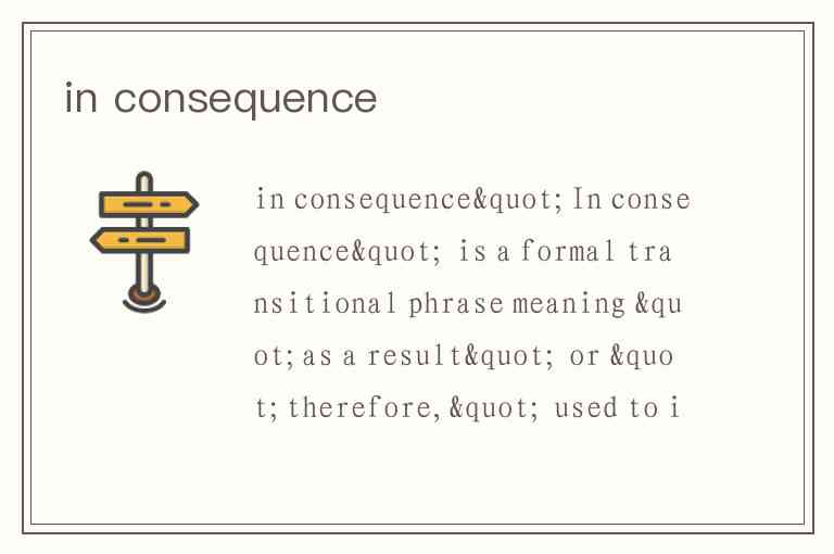 "In consequence" is a formal transitional phrase meaning "as a result" or "therefore," used to indicate a direct outcome of a previous action, event, or situation. It often appears at the beginning of a sentence to connect cause and effect clearly in academic writing, formal reports, or legal contexts.