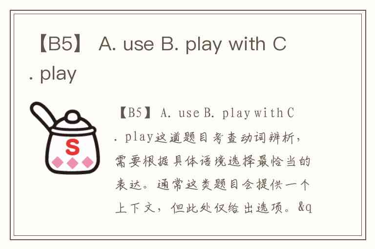 这道题目考查动词辨析,需要根据具体语境选择最恰当的表达。通常这类题目会提供一个上下文,但此处仅给出选项。"use"强调工具性使用,"play with"侧重玩耍或随意摆弄,"play"作为及物动词时可接球类、乐器等表示进行某项活动。若语境涉及具体活动如球类(play basketball),选C;若强调使用物品(use a tool),选A;若表示玩耍某物(play with a toy),选B。具体答案需结合完整句子判断,但从常见用法来看,若指进行某项运动或活动,C. play 是最可能的正确答案。
