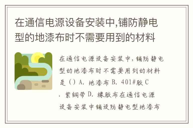 在通信电源设备安装中,铺防静电型的地漆布时不需要用到的材料是 ( ) A. 地漆布 B. 401#胶 C. 紫铜带 D. 橡胶布