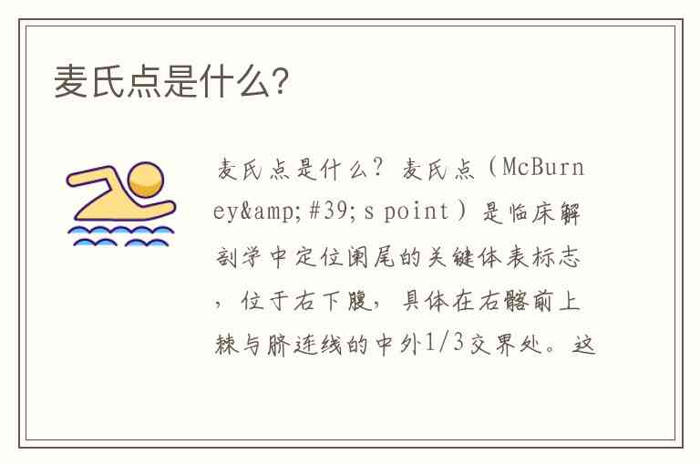 麦氏点(McBurney's point)是临床解剖学中定位阑尾的关键体表标志,位于右下腹,具体在右髂前上棘与脐连线的中外1/3交界处。这个点位因对应阑尾根部的解剖位置而得名,是医生诊断急性阑尾炎和规划手术切口的核心参考。