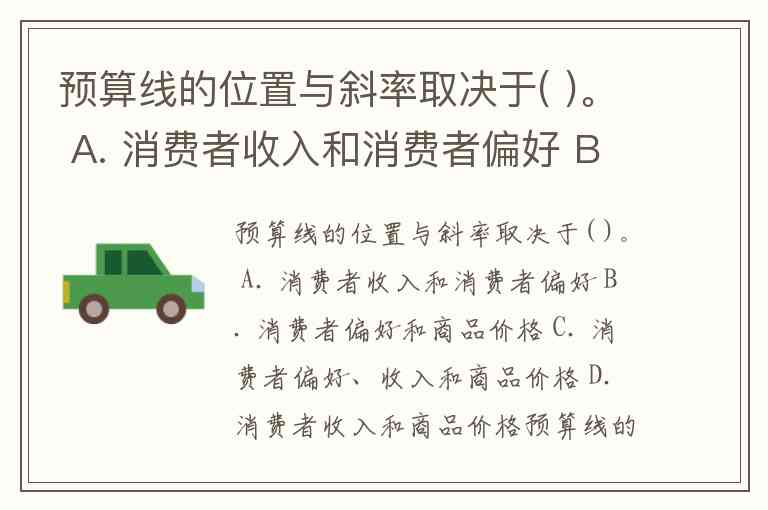 预算线的位置与斜率取决于( )。 A. 消费者收入和消费者偏好 B. 消费者偏好和商品价格 C. 消费者偏好、收入和商品价格 D. 消费者收入和商品价格