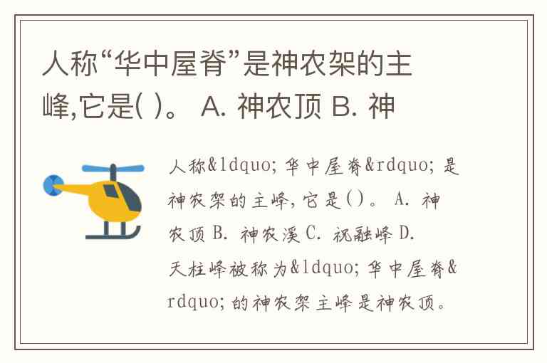 人称“华中屋脊”是神农架的主峰,它是( )。 A. 神农顶 B. 神农溪 C. 祝融峰 D. 天柱峰