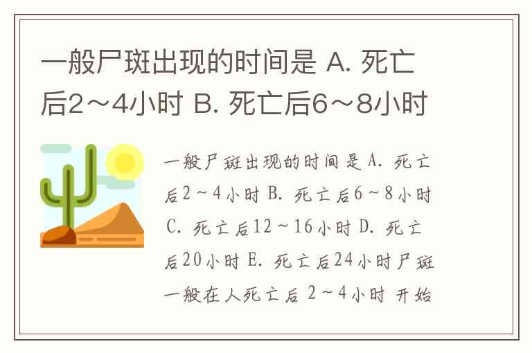 一般尸斑出现的时间是 A. 死亡后2~4小时 B. 死亡后6~8小时 C. 死亡后12~16小时 D. 死亡后20小时 E. 死亡后24小时