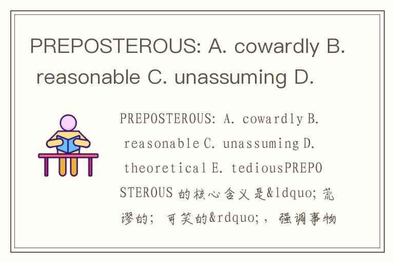 PREPOSTEROUS: A. cowardly B. reasonable C. unassuming D. theoretical E. tedious