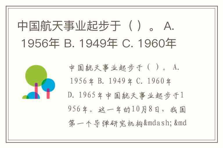 中国航天事业起步于( )。 A. 1956年 B. 1949年 C. 1960年 D. 1965年