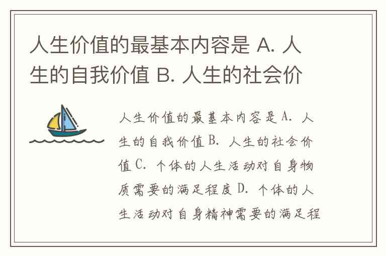 人生价值的最基本内容是 A. 人生的自我价值 B. 人生的社会价值 C. 个体的人生活动对自身物质需要的满足程度 D. 个体的人生活动对自身精神需要的满足程度