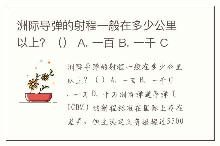 洲际导弹的射程一般在多少公里以上?() A. 一百 B. 一千 C. 一万 D. 十万