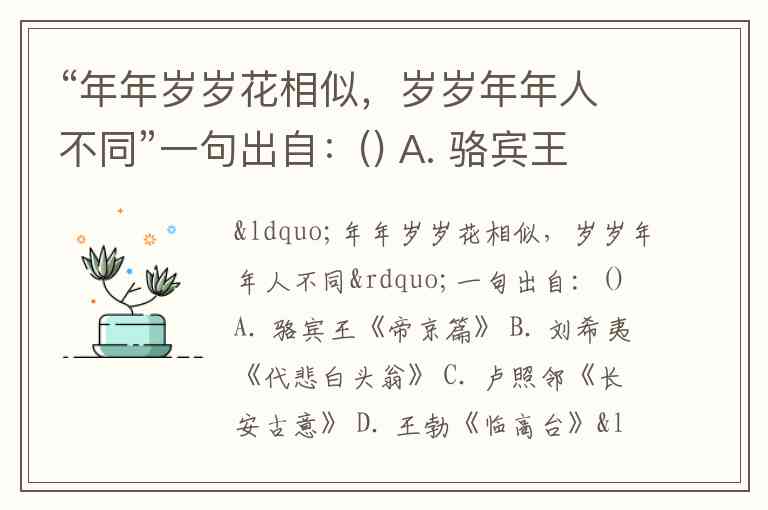 “年年岁岁花相似,岁岁年年人不同”一句出自:() A. 骆宾王《帝京篇》 B. 刘希夷《代悲白头翁》 C. 卢照邻《长安古意》 D. 王勃《临高台》