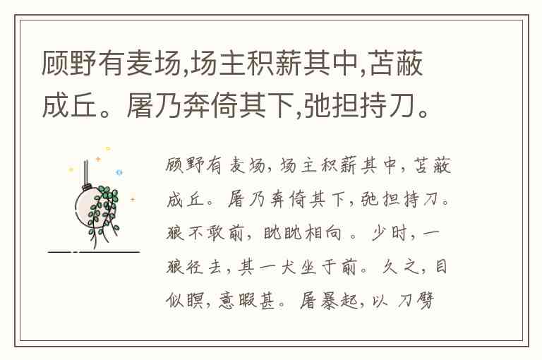 屠户的转变远非单纯的"拼死自卫"。从"投以骨"的妥协试探,到"顾野有麦场"的环境观察,再到"暴起劈狼首"的战术执行,最后"转视积薪后"的彻底清剿,每个动作都体现着主动决策而非被动防御。尤其是"顾"字暗藏关键:在生死关头仍能留意到"积薪成丘"的地形优势,这种临危不乱的判断力,恰是战胜两狼的核心原因。